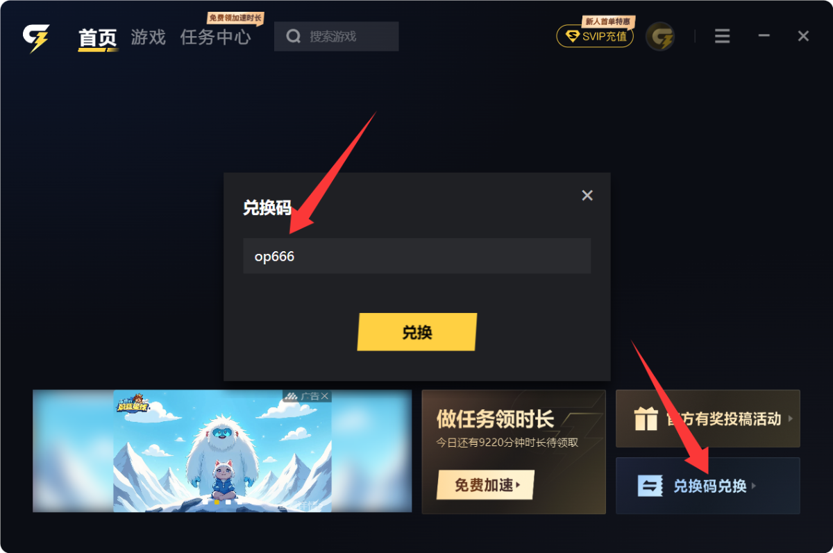 在所有的加速器页面找到兑换码,输入口令“op666”即可。这里演示了迅雷游戏加速器的获取教程,雷神和奇妙都是这样获取时长的哦。