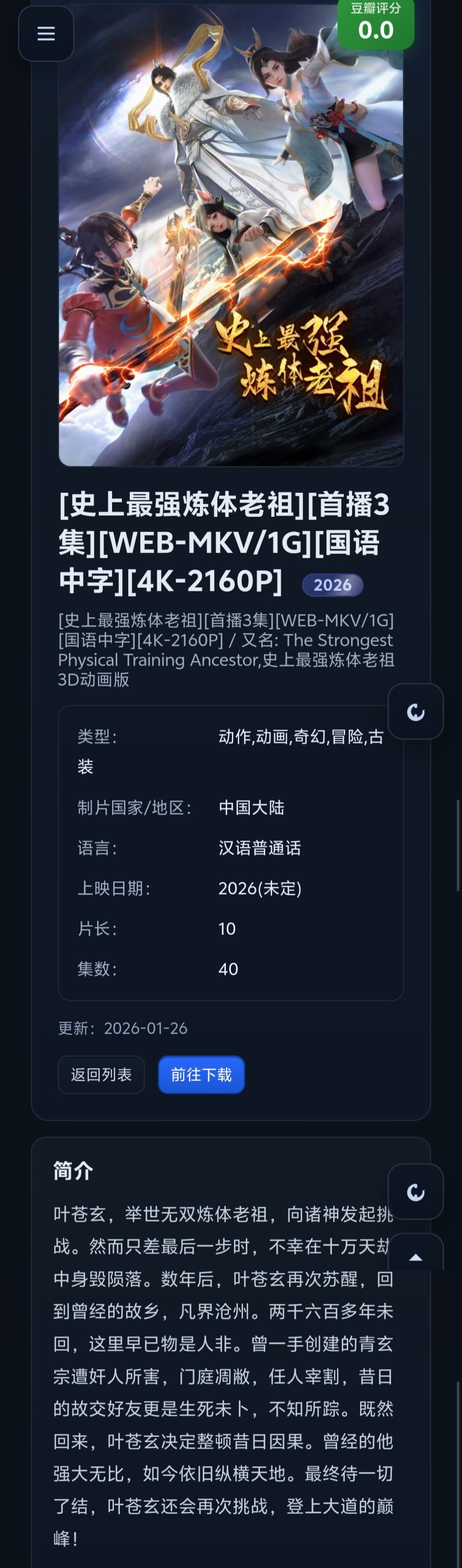 [史上最强炼体老祖]2026[首播3集][WEB-MKV/1G][国语中字][4K-2160P]【1.5G】