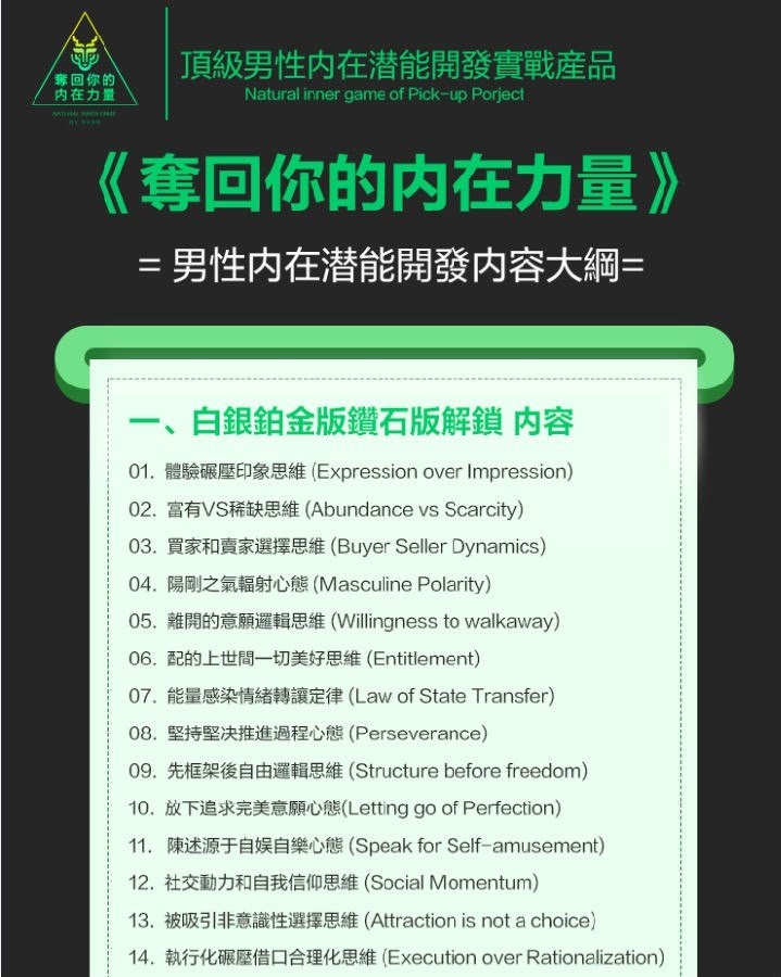 实战7大模块:自信重建、情绪掌控、边界设定、性吸引力、人生使命、领导力觉醒 ;