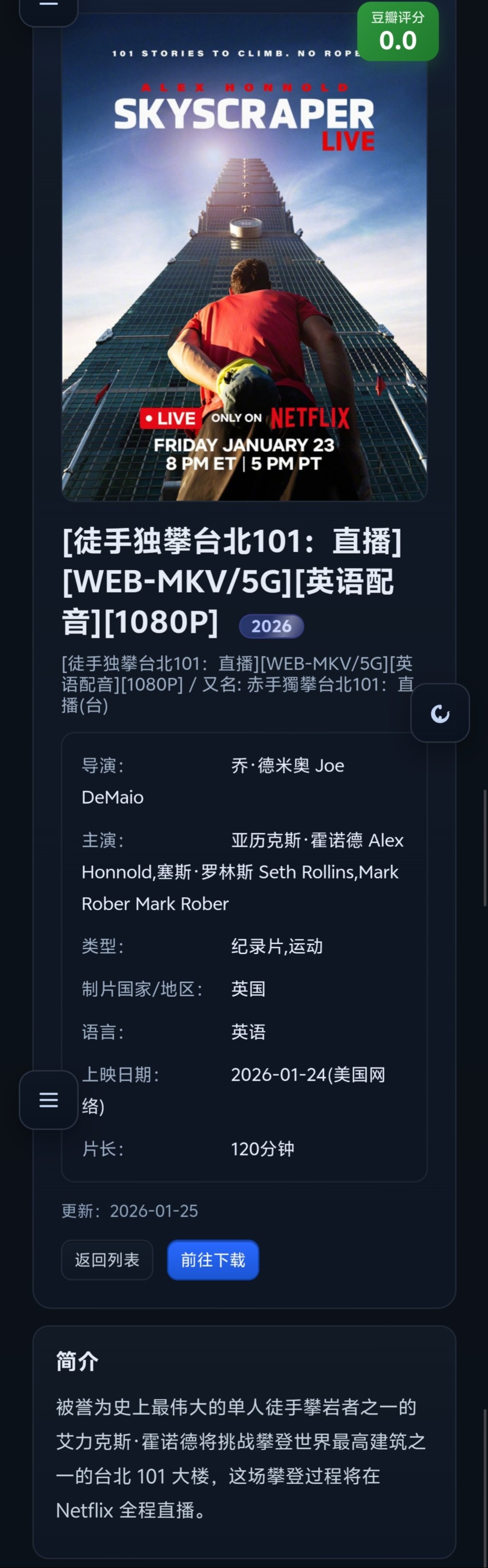 [徒手独攀台北101:直播][WEB-MKV/5G][英语配音][1080P] 2026